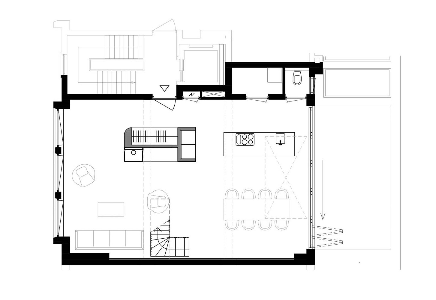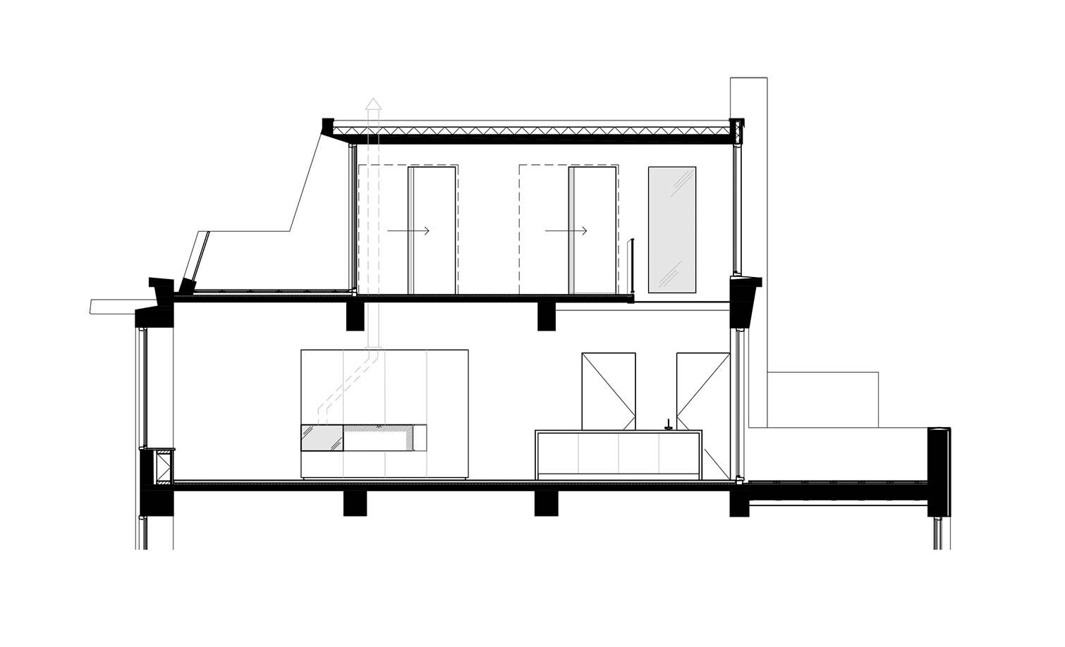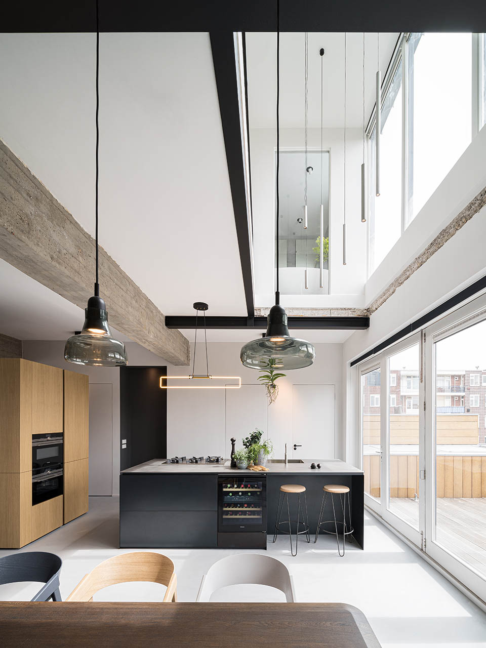 De keuken is aan de zonzijde gepositioneerd met uitloop naar het ruime dakterras. Op een zomerdag kan de gehele pui worden geopend waardoor het terras een verlengstuk van de woning wordt. In de bestaande betonvloer zijn diverse openingen gemaakt om interactie tussen boven en beneden te versterken. Vanuit het ligbad kijk je neer in de eetkeuken maar kijk je ook uit over Rotterdam. In het midden van de woning is een houten kern ontworpen waarin de kachel, garderobe en keukenapparatuur zijn geïntegreerd. De trap is vorm gegeven als een zwarte eyecatcher die de ruwe karakter van de betonbalken completeert.