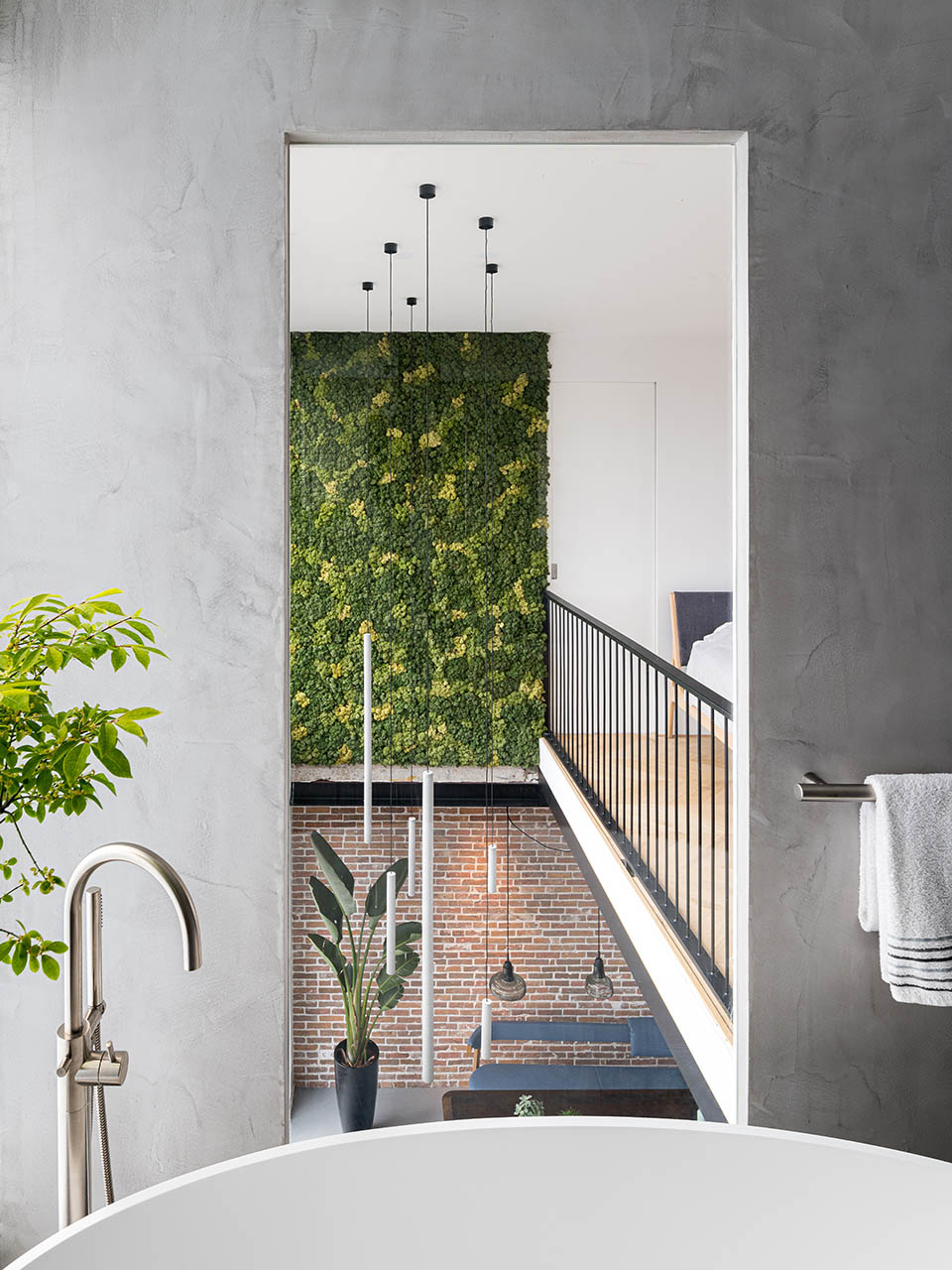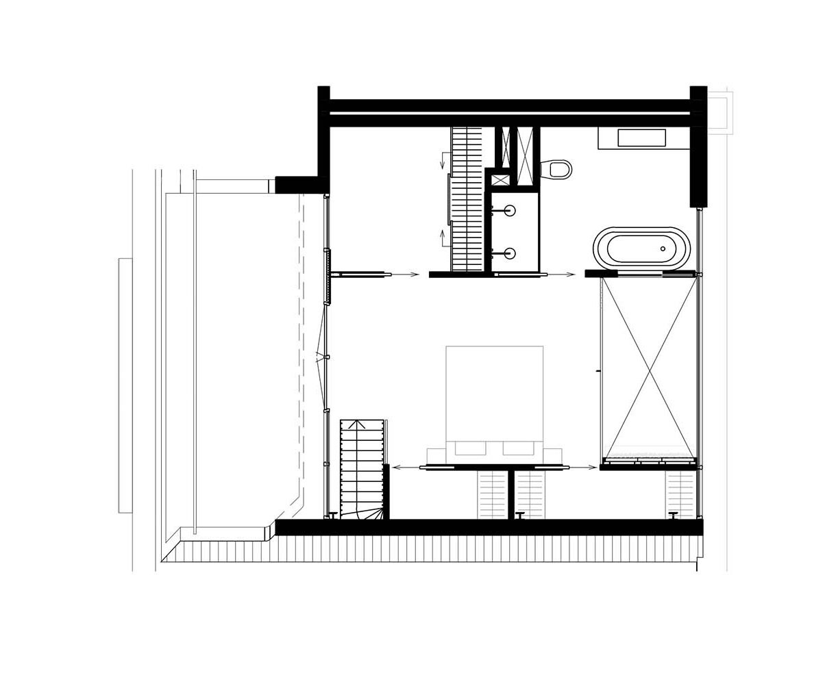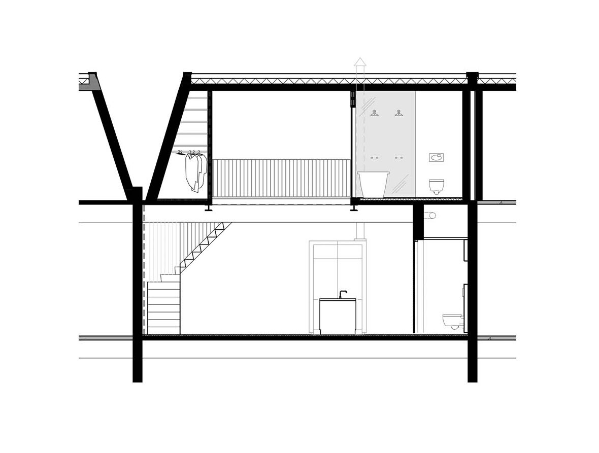 De keuken is aan de zonzijde gepositioneerd met uitloop naar het ruime dakterras. Op een zomerdag kan de gehele pui worden geopend waardoor het terras een verlengstuk van de woning wordt. In de bestaande betonvloer zijn diverse openingen gemaakt om interactie tussen boven en beneden te versterken. Vanuit het ligbad kijk je neer in de eetkeuken maar kijk je ook uit over Rotterdam. In het midden van de woning is een houten kern ontworpen waarin de kachel, garderobe en keukenapparatuur zijn geïntegreerd. De trap is vorm gegeven als een zwarte eyecatcher die de ruwe karakter van de betonbalken completeert.