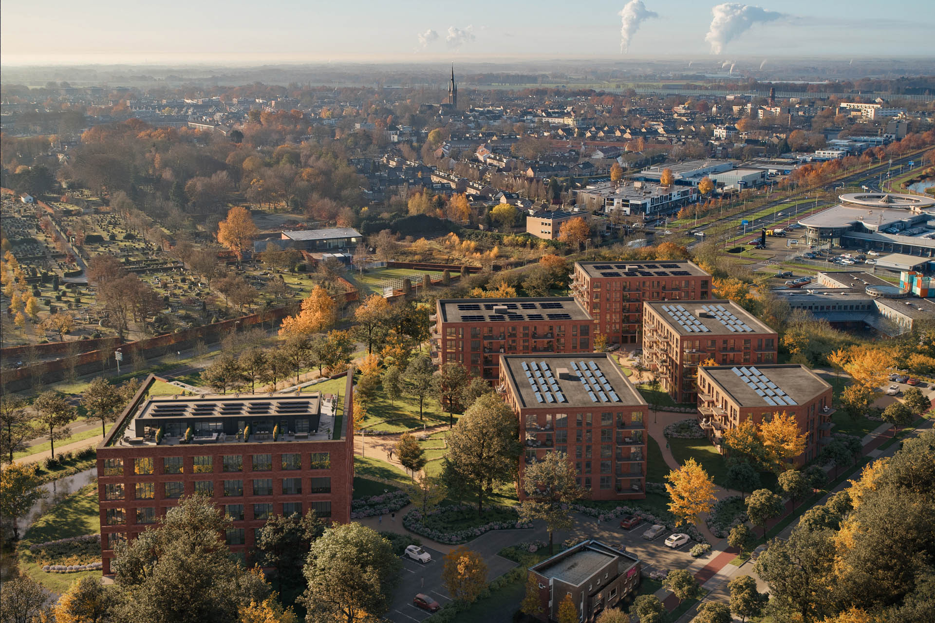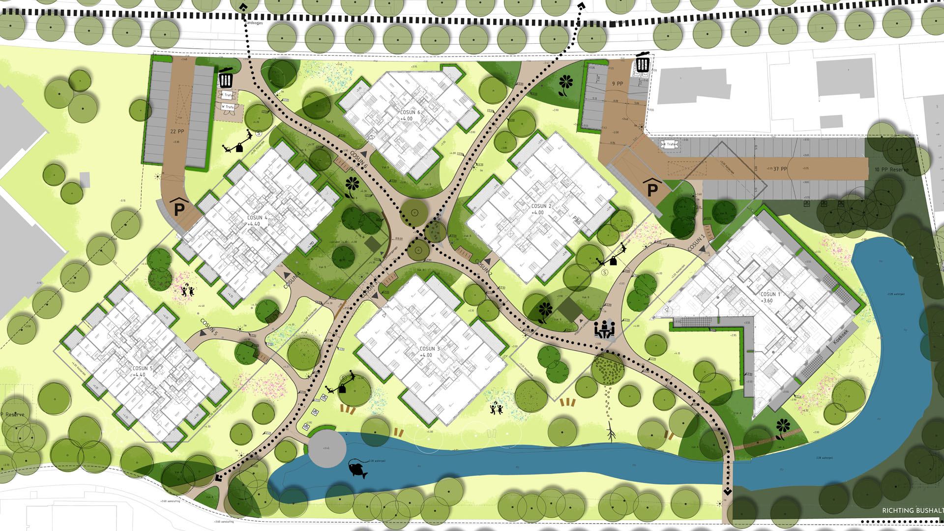 De woongebouwen staan in de basis in een dambordverkaveling, maar zijn niet vierkant. Door met de rechthoekige fotoprints te schuiven en te draaien ontstaan er zichtlijnen die ook weer beëindigd worden op gebouwen. Hierdoor ontstaan er spannende ruimtes en worden verblijfsplekken geduid. Al het parkeren wordt onder de grond opgelost en de groenstructuren van de omliggende wijken wordt doorgezet op Cosunpark. Op de begane grond wordt overal gewoond en de gebouwen zijn alzijdig waardoor er overal levendigheid en leefbaarheid ontstaat. Bestaande grote bomen blijven staan en er wordt veel groen toegevoegd zodat de nieuwe bewoners straks echt in een park wonen. De woongebouwen worden uit metselwerk opgetrokken met een betonnen plint in dezelfde tint. Dit sluit aan bij het bestaande gebouw van de Suikerunie dat gerenoveerd wordt.