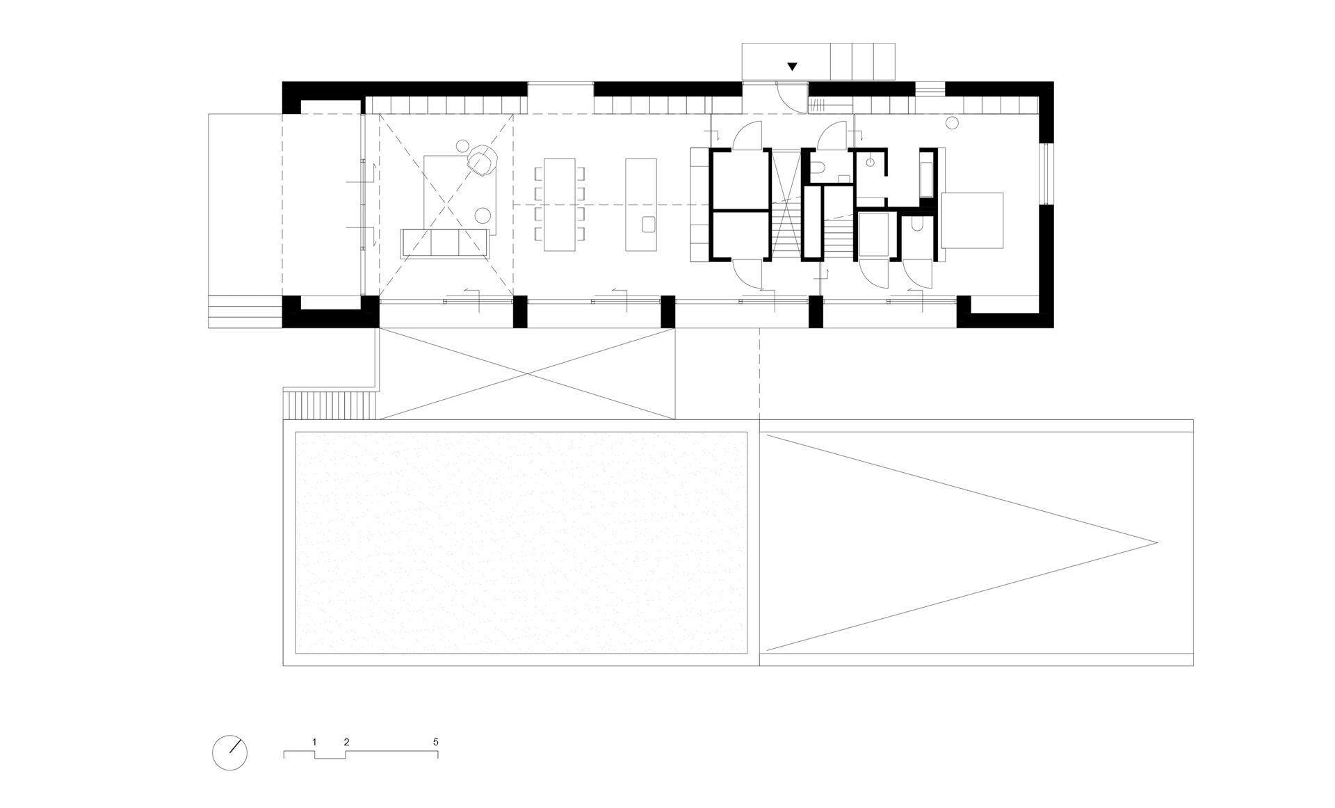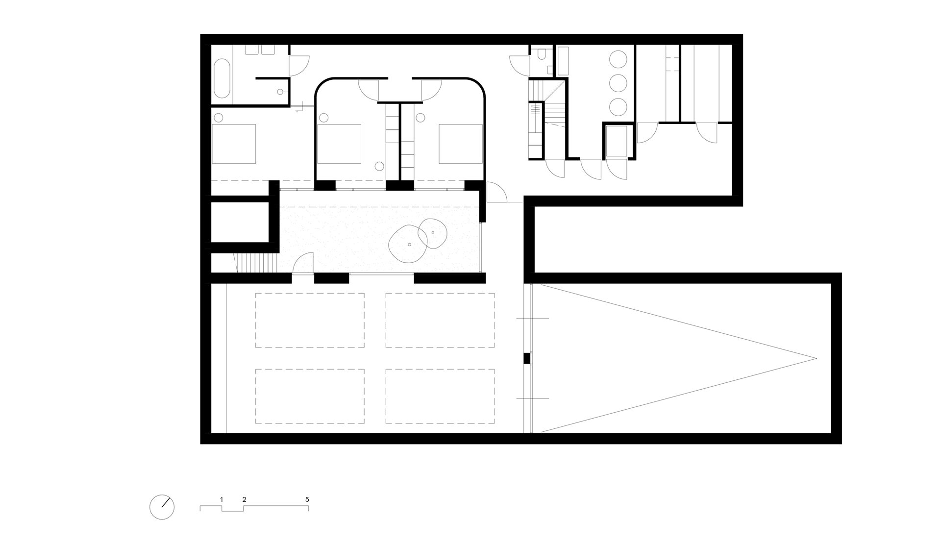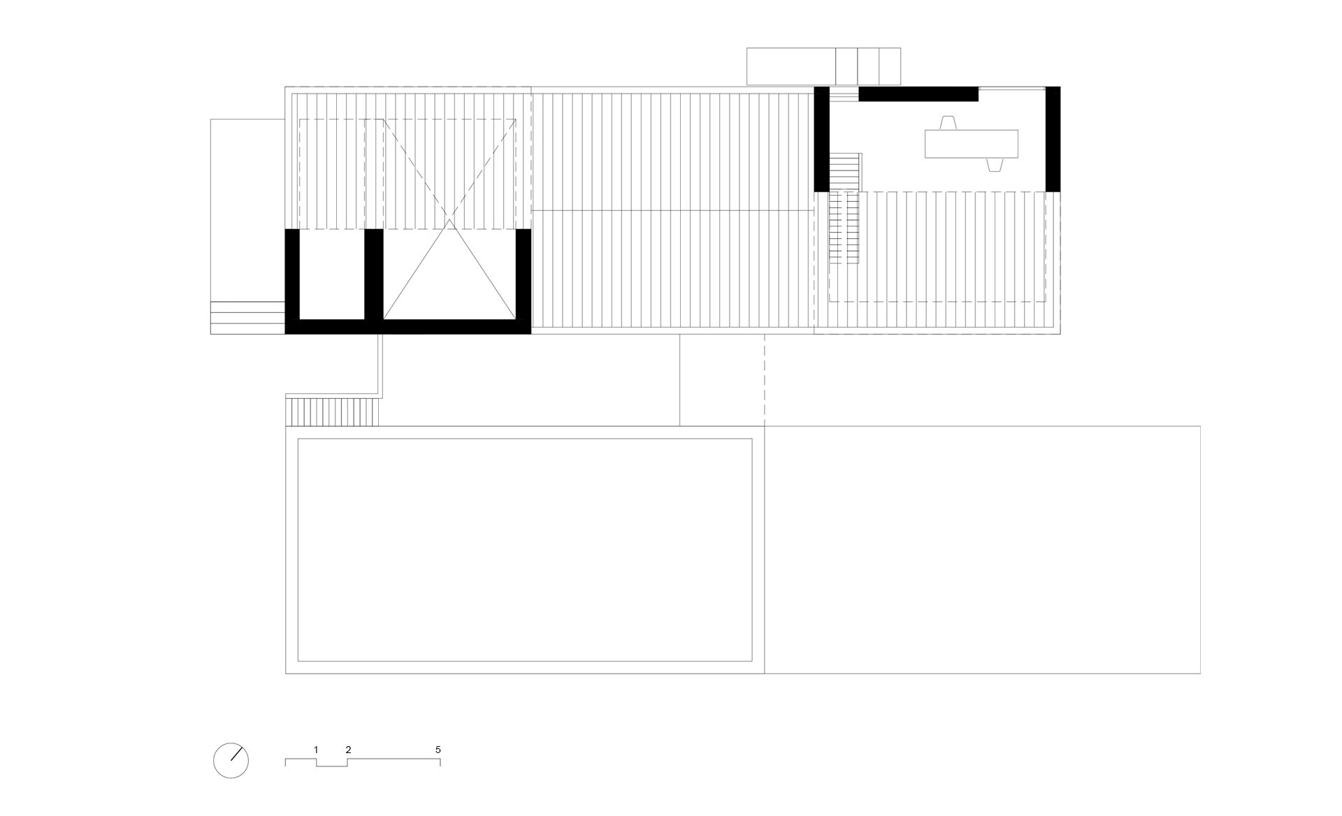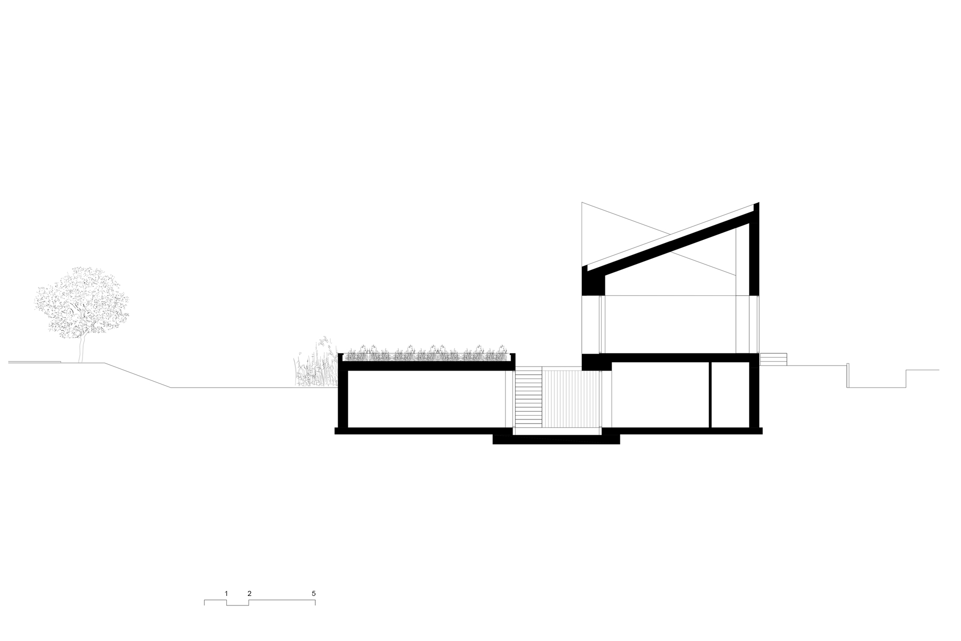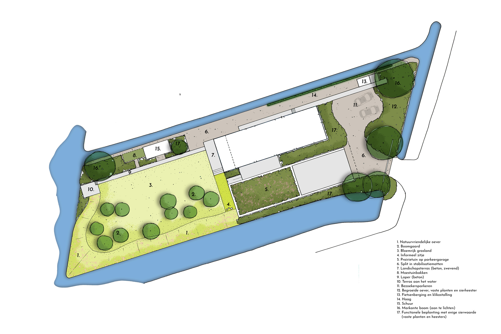 Het maaiveld ligt op deze plek vrij laag. Om er voor te zorgen dat de woning niet ‘wegzakt’ ligt de begane grond ca. 70 cm boven maaiveld. Hierdoor behouden we de natuurlijke oevers als mooi contrast op het monolithische karakter van de woning. Het dak van de garage wordt ingericht als wilde bloementuin en regelt op deze manier de privacy van de woning naar het fietspad. Door de spiegelsymmetrische opzet van de hoofdmassa worden de gevelopeningen binnen een rustige ritmiek in de gevel geplaatst. Diepe negges aan de zuidzijde voorkomen de opwarming van de woning, bieden de gewenste geborgenheid op deze plek en versterken wederom de zwaarte van de woning.
