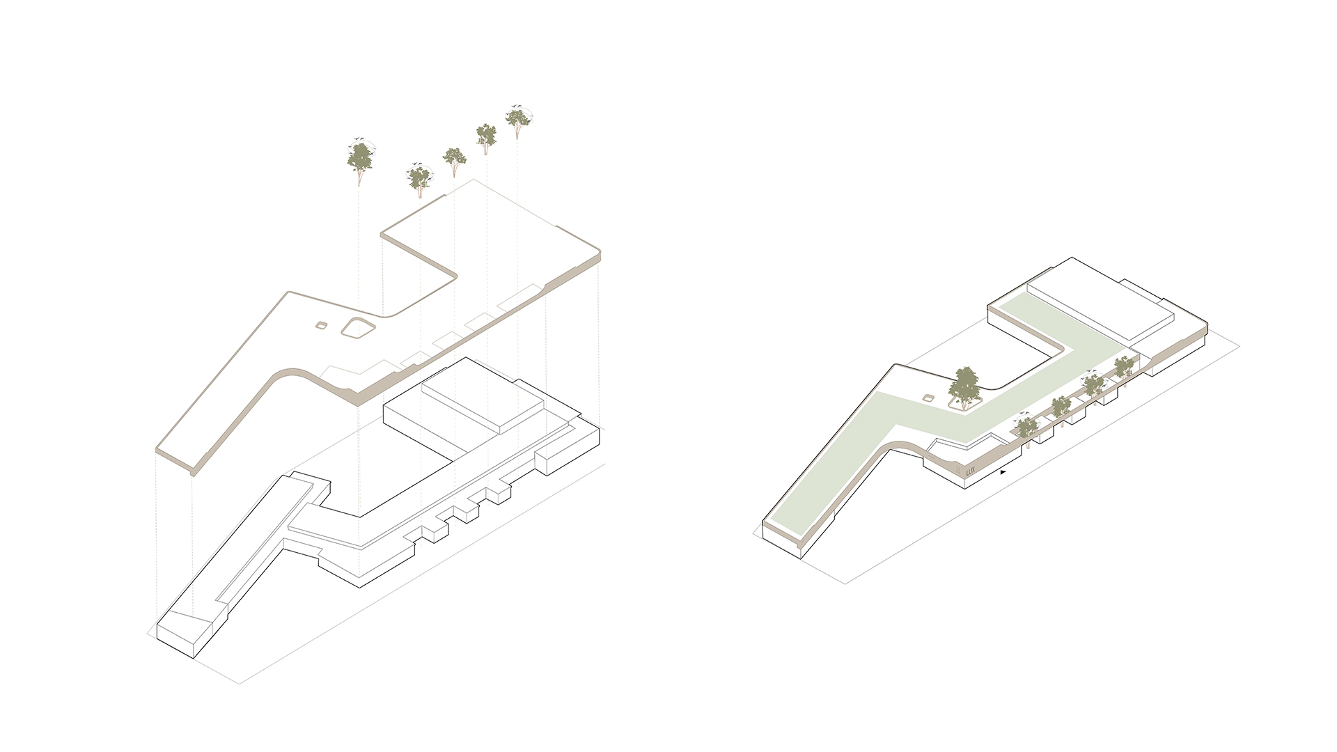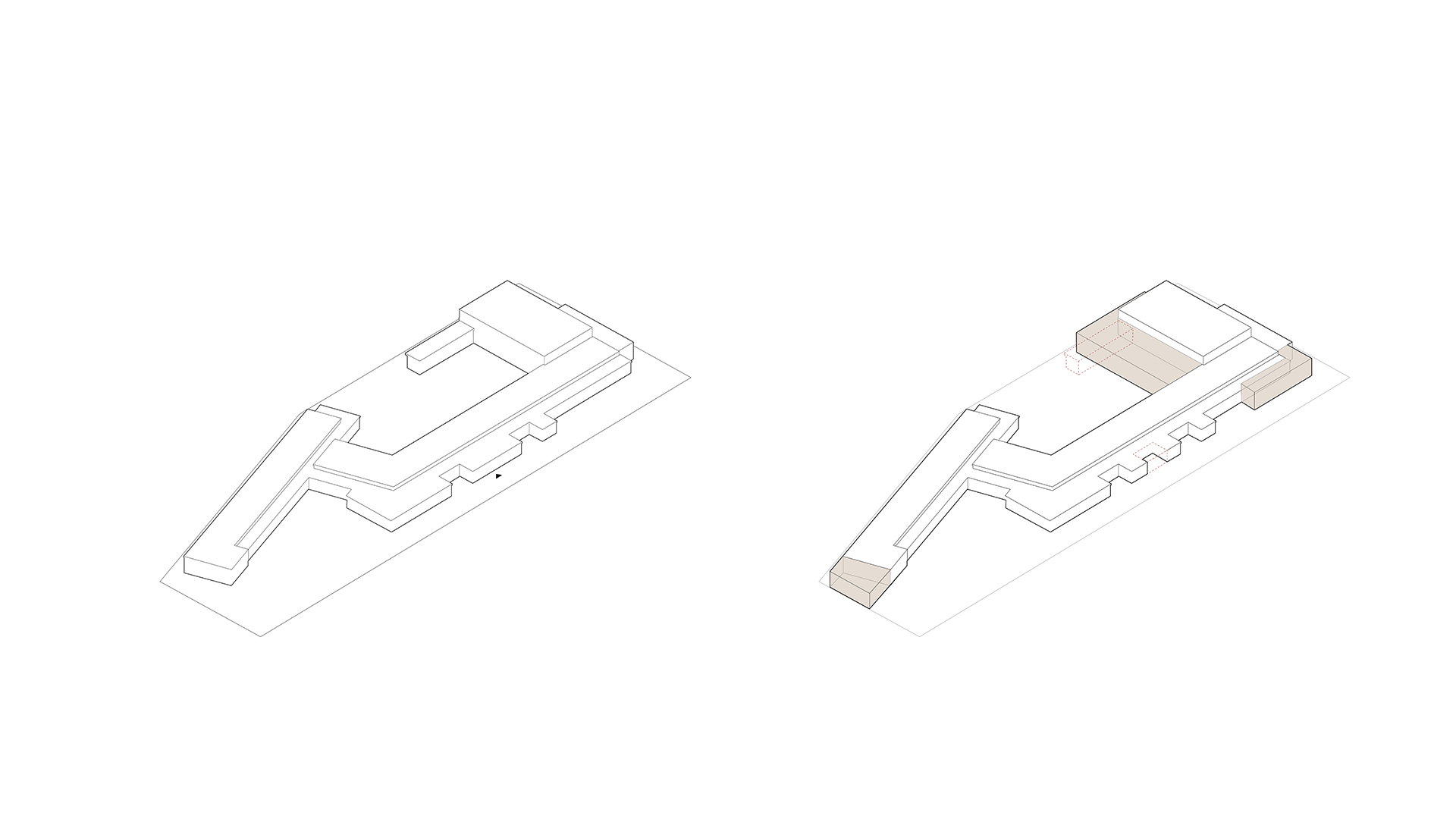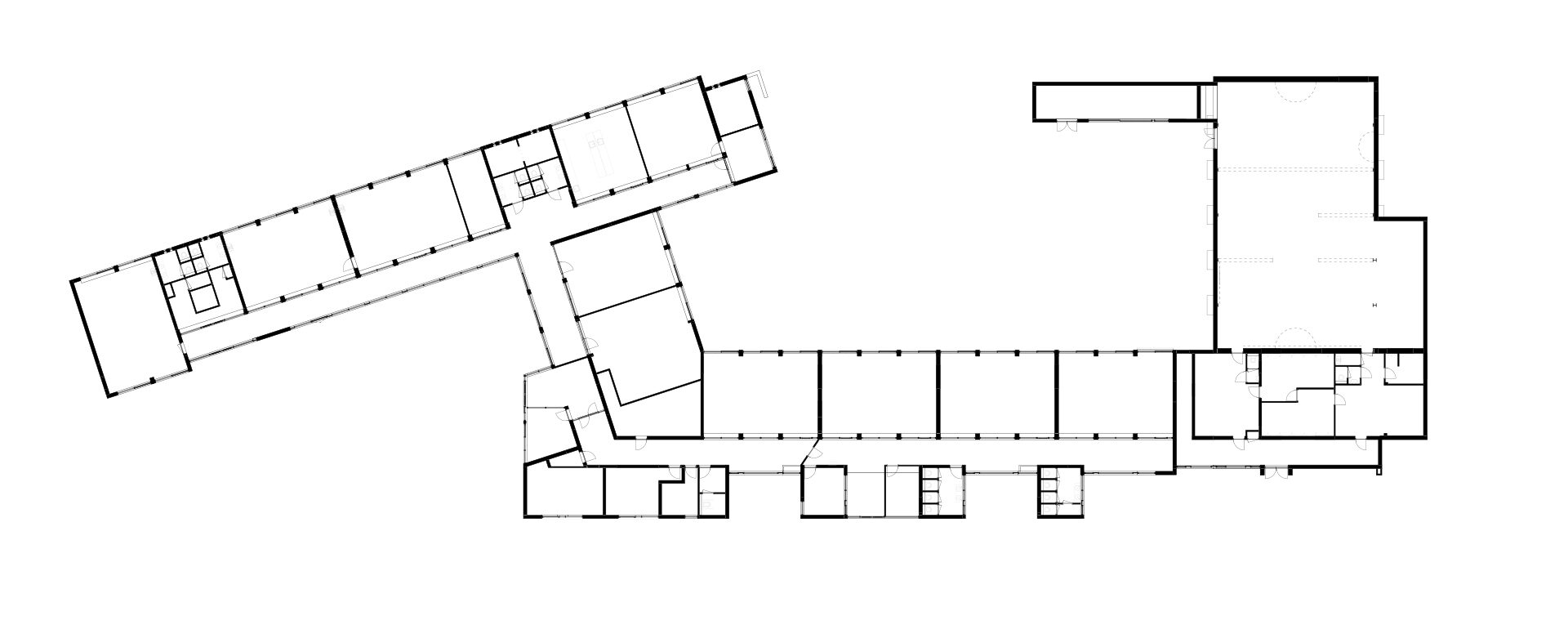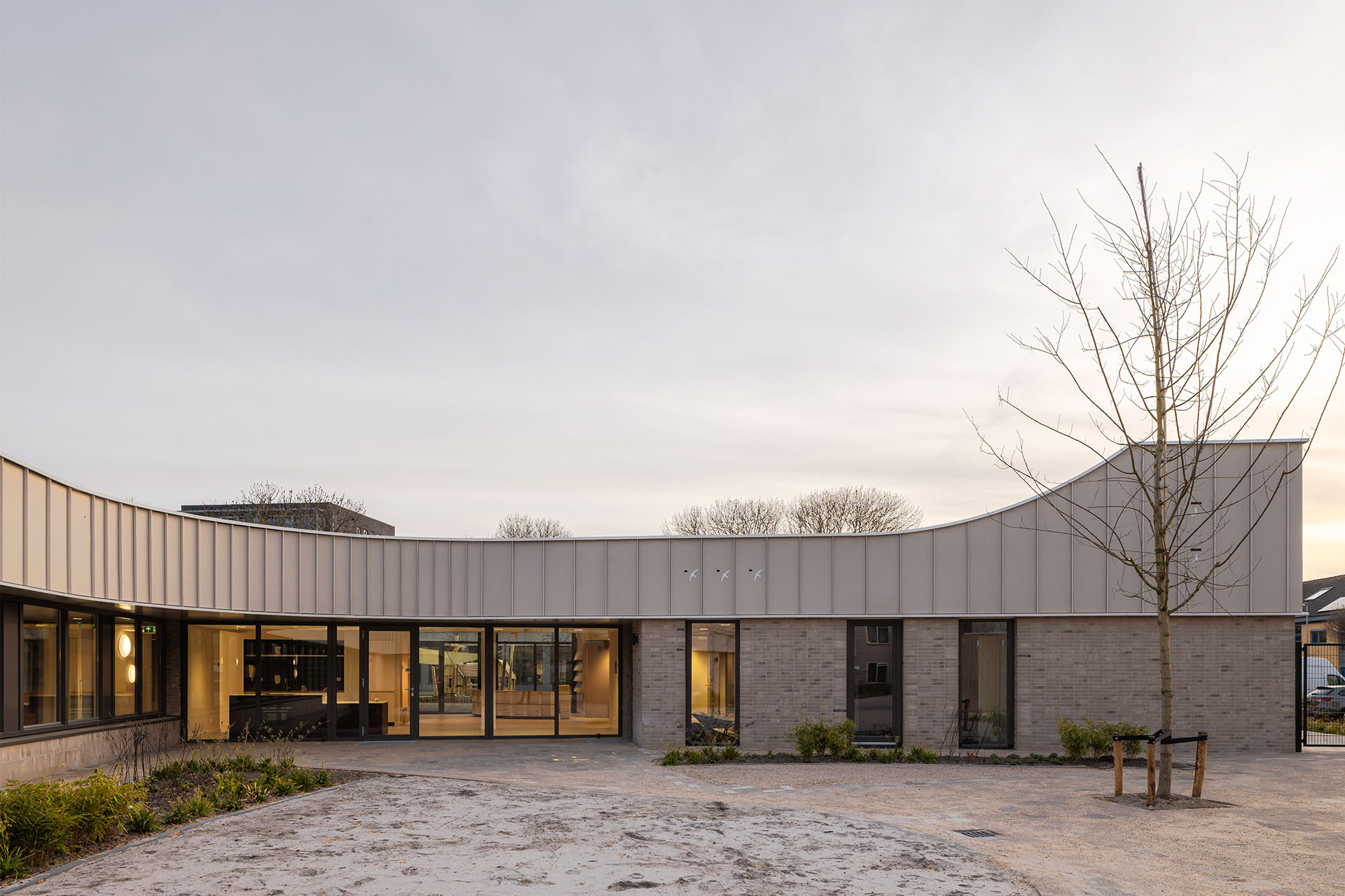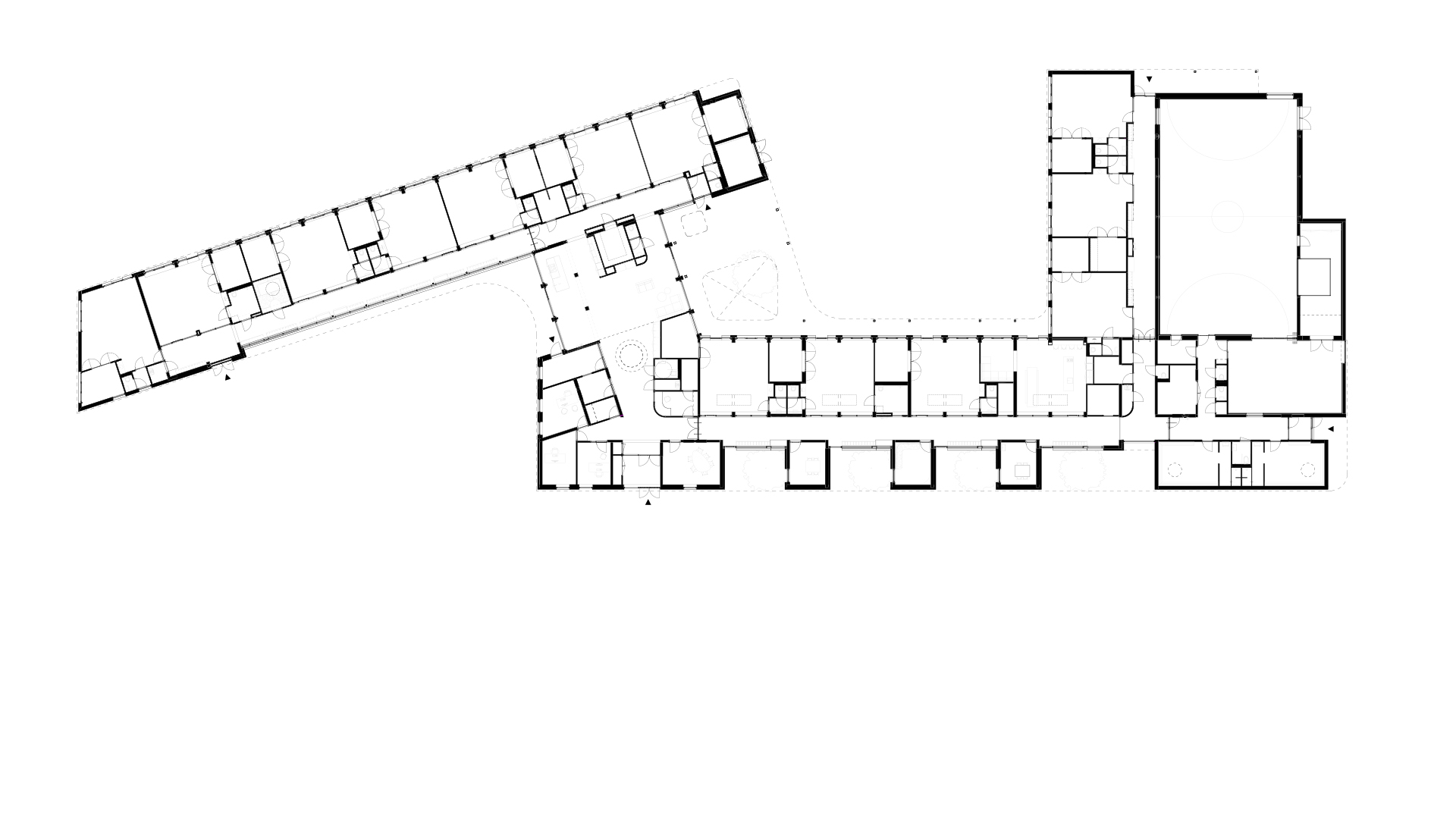 Het ontwerp is vanuit de bestaande doorsnede ontwikkeld. De gangzones aan de Stauntonstraat liggen lager dan de aangrenzende groepsruimten. Door hier alle nieuwe installaties te organiseren kunnen we zowel de gangzones als de groepsruimten bereiken en ontstaat door de geïsoleerde afscherming hiervan een nieuwe gevel die we inzetten voor de architectuur.