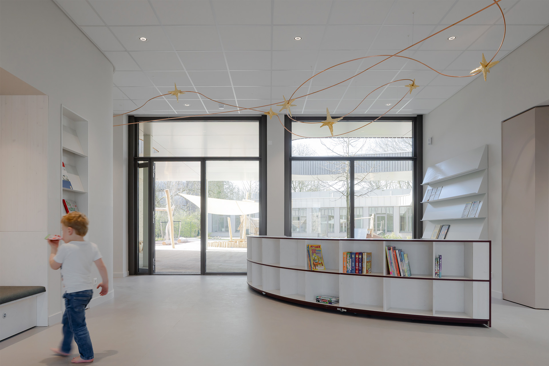 De hoofddraagconstructie van de school bestaat uit gemetselde kolommen met om de drie stramienen een dragende muur. De groepsruimten worden in het ontwerp, door de kleine groepen waarin lesgegeven wordt, teruggebracht tot twee stramienen. Het derde stramien vormt de schakel met de naastgelegen groepsruimte en omvat een bijlokaal en een toiletruimte die direct aan de groepsruimte grenst. Zo behoudt de docent het overzicht in de groep. Rondom de hoofdentree liggen de kantoren waarbij we de meer specialistische zorg als logopedie en spelbegeleiding in de bestaande uitbouwen hebben ondergebracht. De teamkamer ligt in de luwte tussen de bestaande school en de nieuwe vleugel.