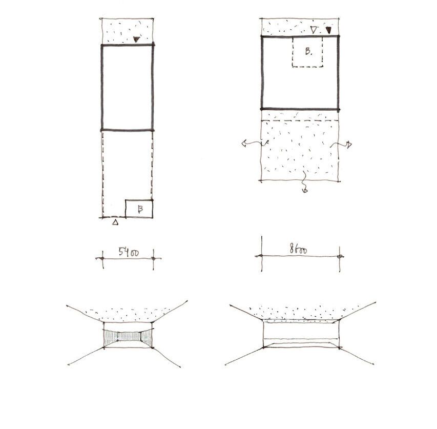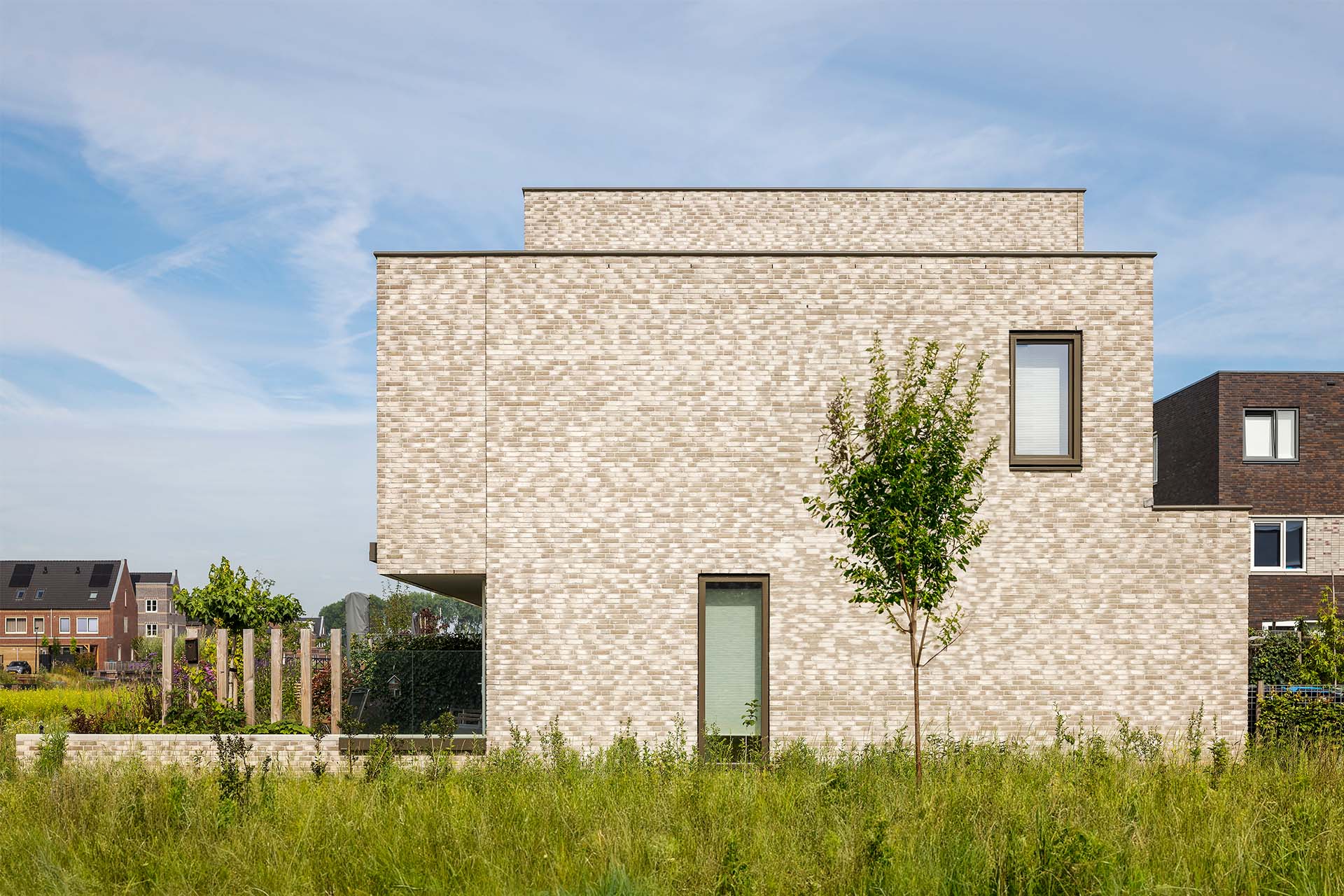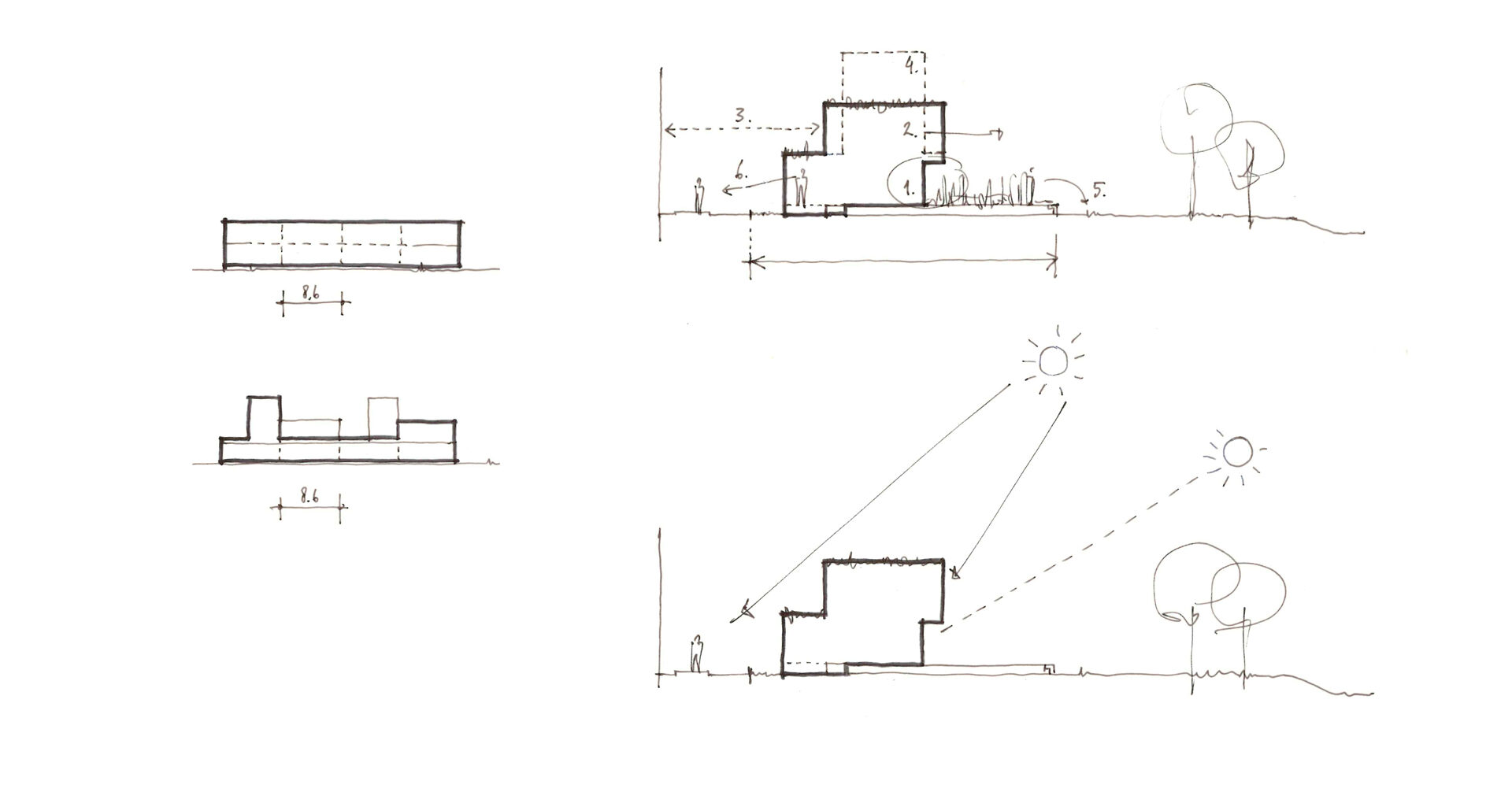 Om een natuurlijke zonwering aan de zuidzijde te generen heeft de begane grond een klein overstek. Zo wordt de zon in de zomer tegengehouden terwijl hij ’s winters naar binnen schijnt. Aan de noordzijde van de woning ligt de aangrenzende bebouwing. Door aan deze kant de verdieping juist terug te laten springen wordt een betere afstand tot de aanliggende bebouwing gecreëerd.