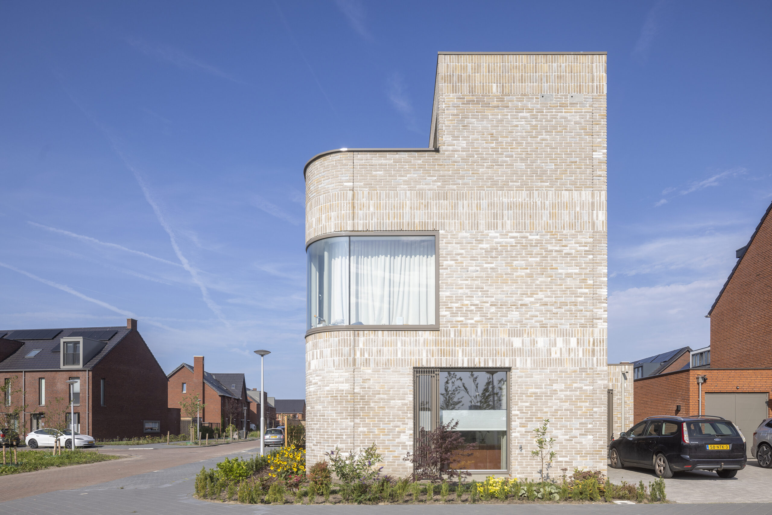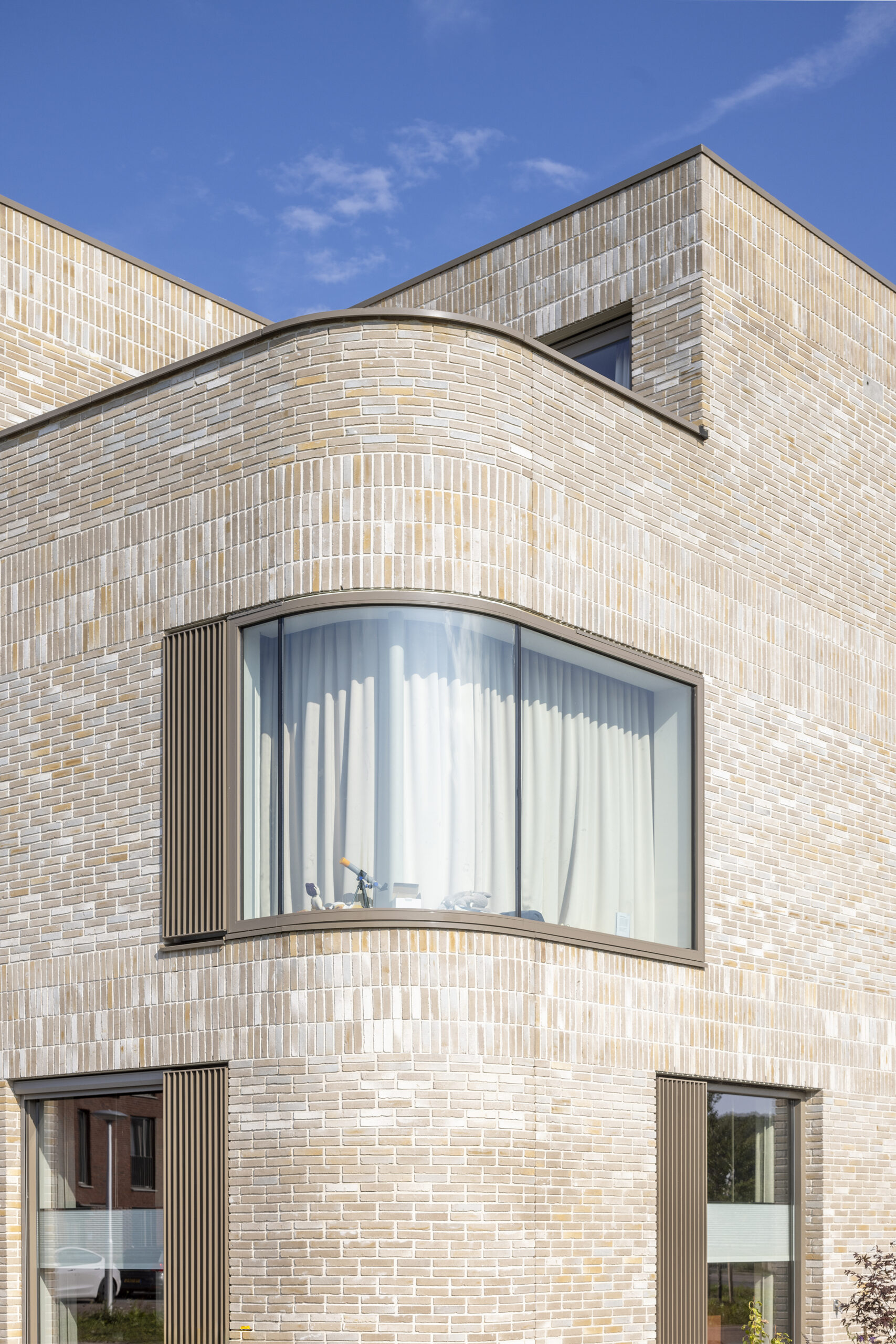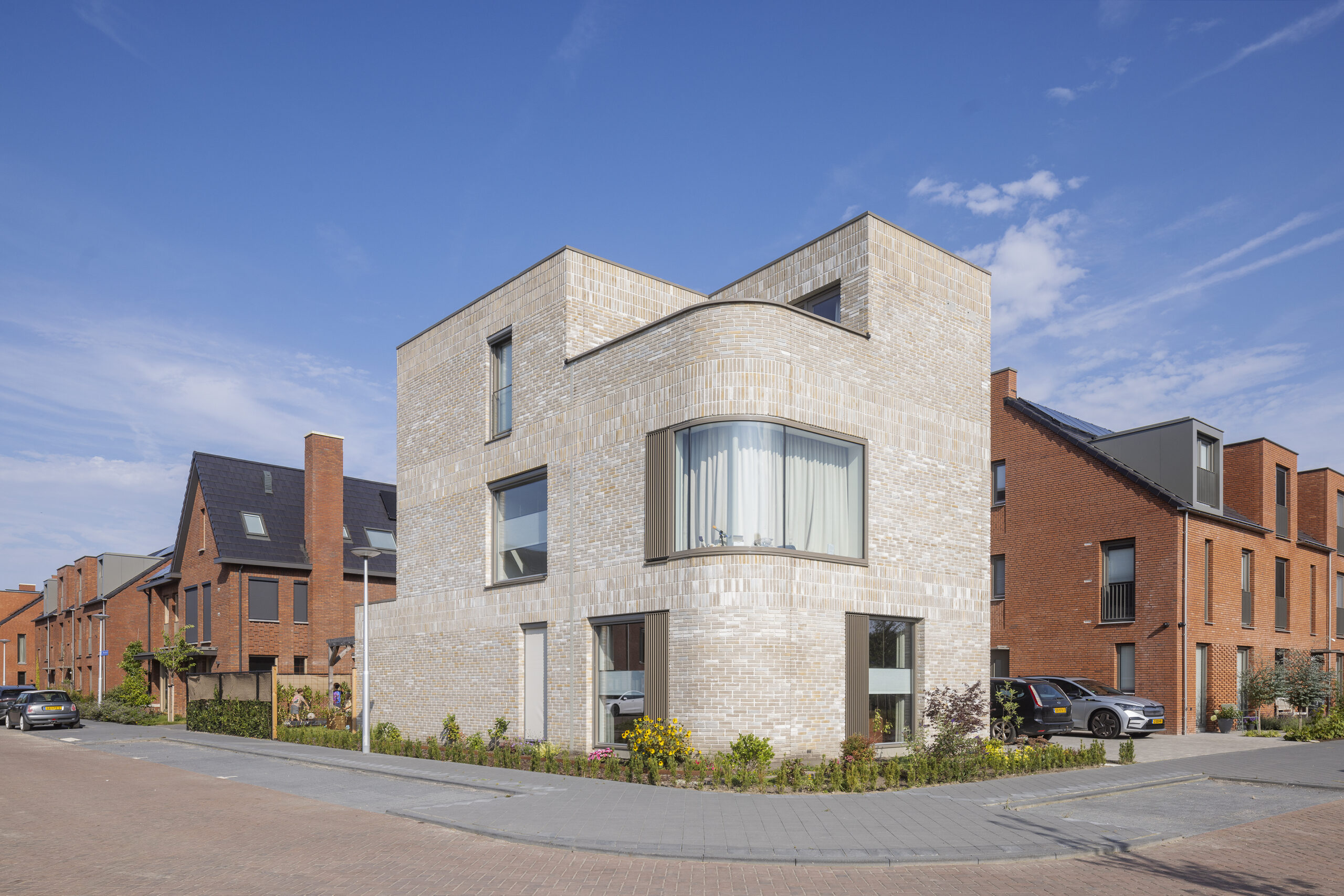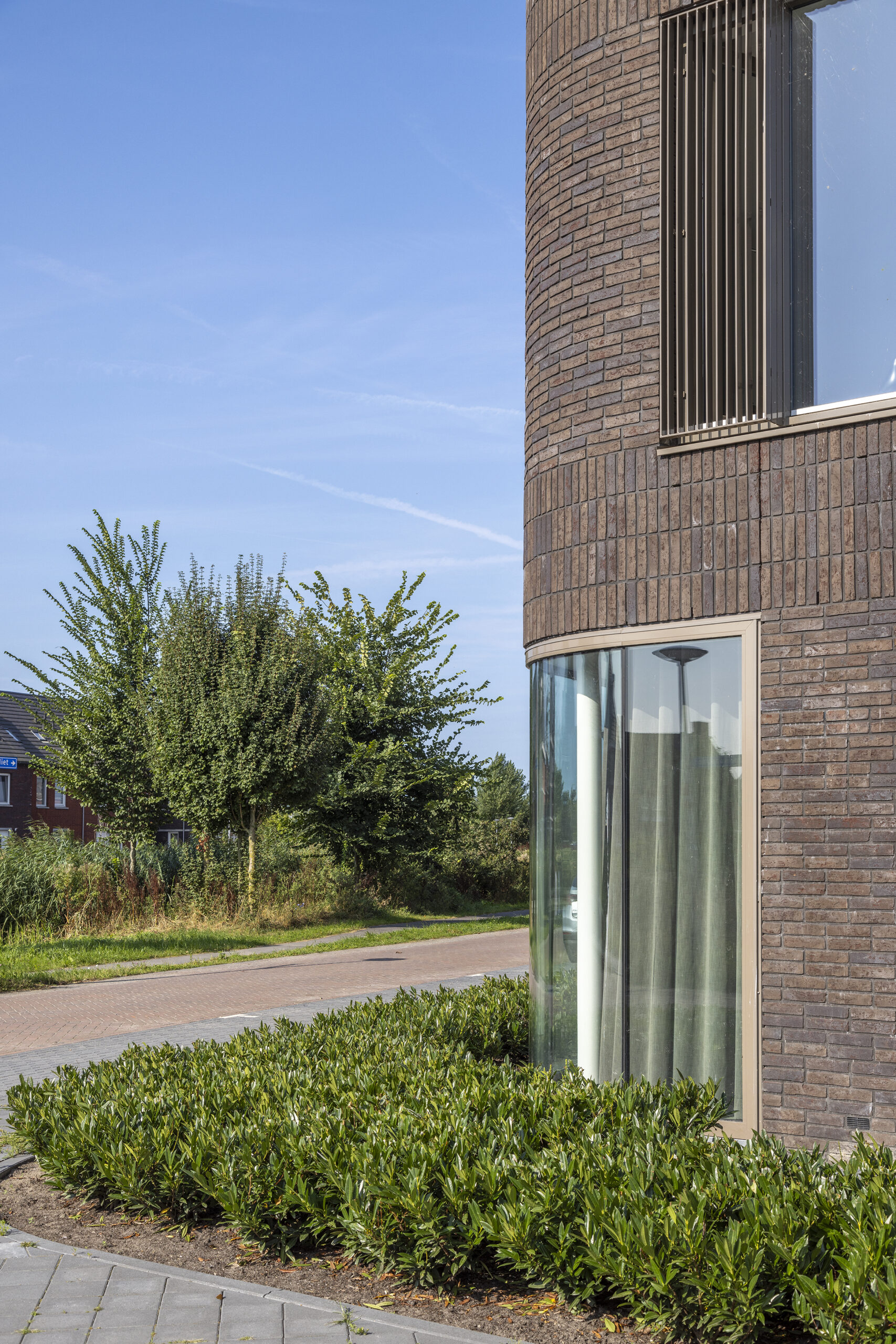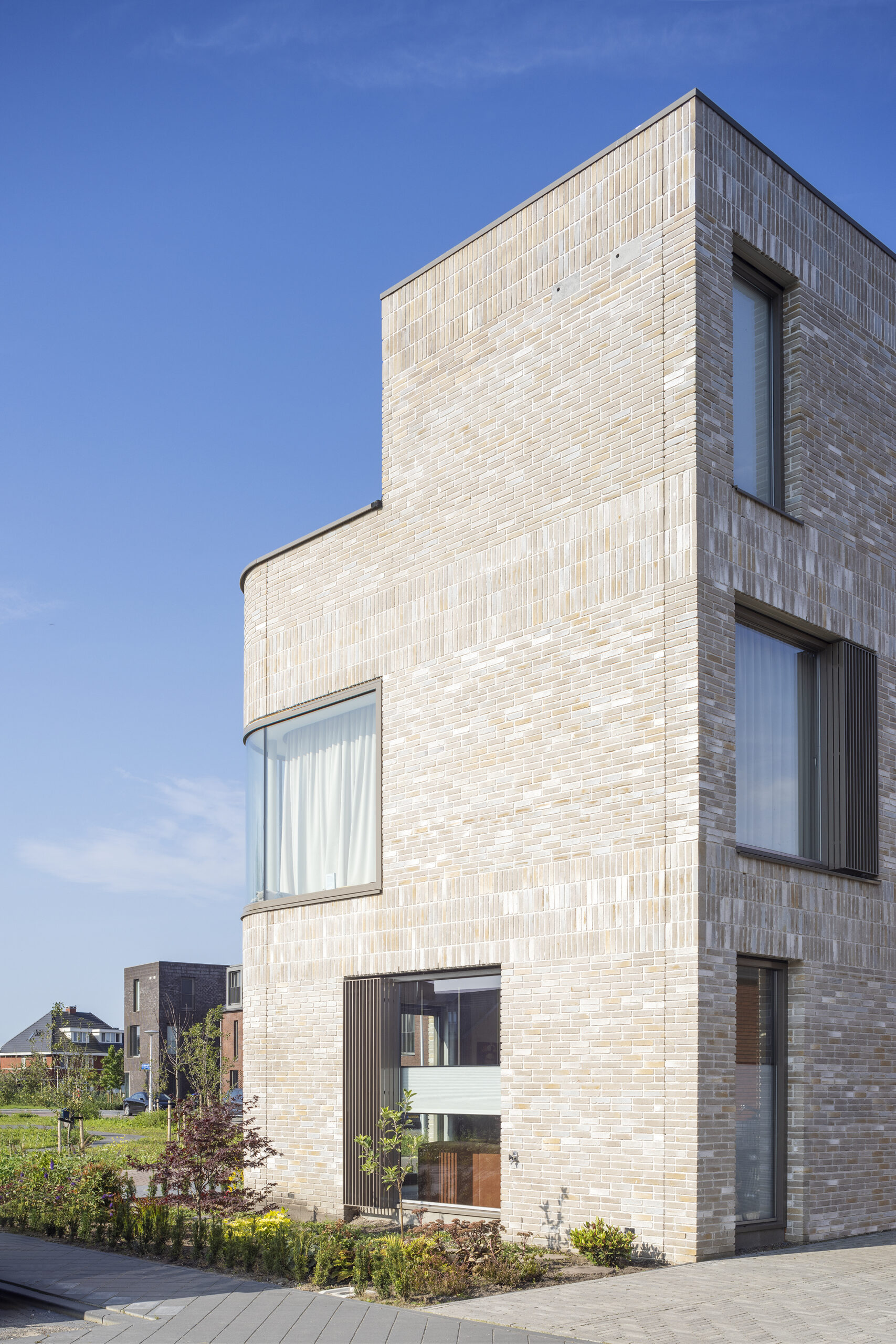 In de nieuwe Utrechtse wijk Rijnvliet hebben wij 10 unieke vrijstaande villa’s ontworpen. De wijk kenmerkt zich door uitzicht op water, veel groen, natuurinclusiviteit en een voedselbos. Op de meest prominente plekken in Rijnvliet zijn 10 specials ontworpen met als gedachte ‘zien en gezien worden’. Door hun markante raampartij op de hoeken wordt het fraaie uitzicht maximaal benut. Tegelijk geeft de rijke detaillering van de gevel de woningen statuur en vormen zij met hun afwijkende steenkleur een markering van de stedenbouwkundige hoeken. De te openen ramen worden bedekt door aluminium lamellen, het metselwerk is rijk gedetailleerd en nestkasten zijn in de gevel geïntegreerd. Het dak biedt ruim plaats voor de zonnepanelen, al zijn deze niet zichtbaar door de verhoogde dakopstand.